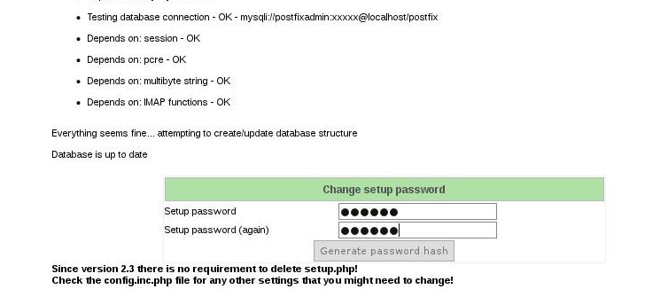 Entrez un mot de passe de setup dans les champs prévu à cet effet, pour obtenir un hash de ce mot de passe, que vous irez ensuite reporter dans le fichier de configuration de postfixadmin :
