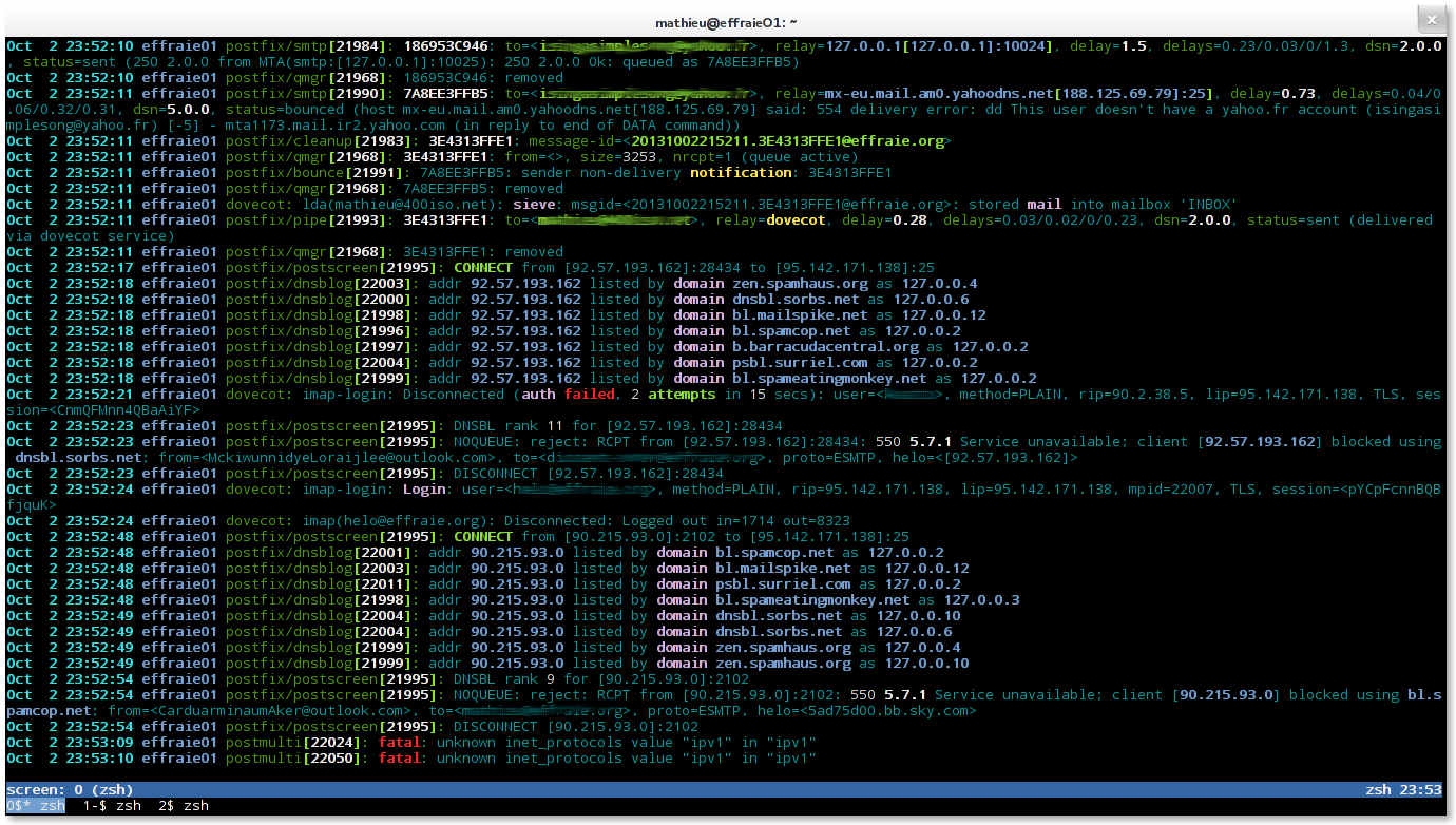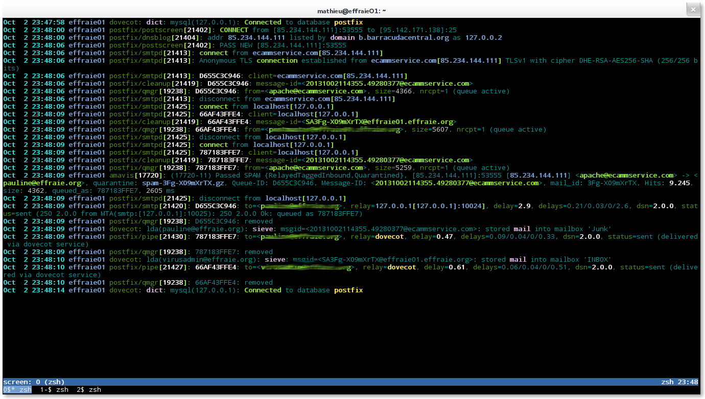 Chaque fois que vous relancerez un service, tel que postfix, dovecot, amavis ou spamassassin, il est impératif que vous ayez en même temps le mail.log qui défile sous vos yeux, sinon vous courez à la catastrophe.