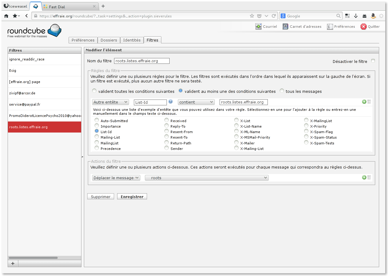 Ci dessous, une capture d'écran utilisée pour filtrer les email de la liste roots@listes.effraie.org :