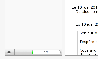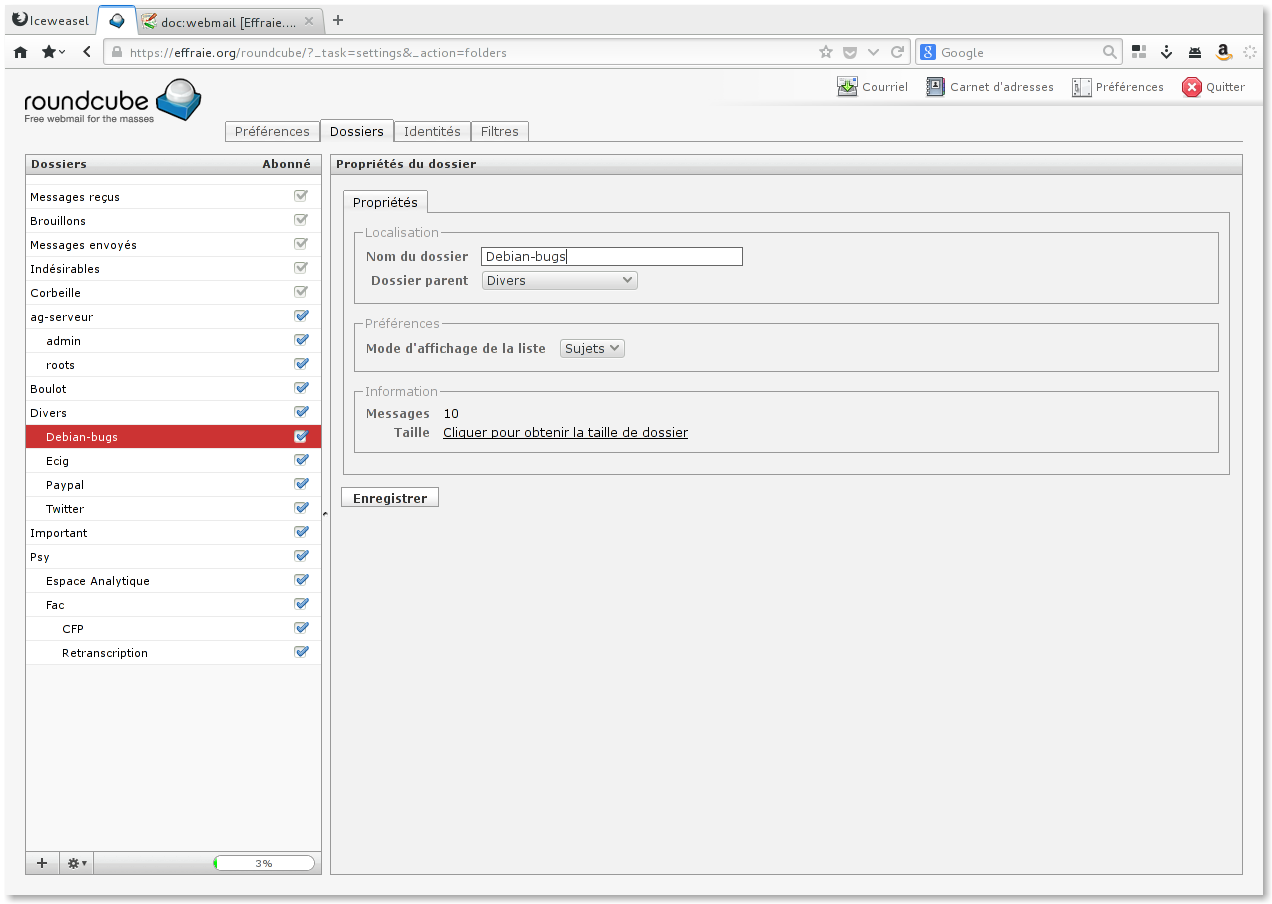 Pour mieux se partager le serveur, un système de quota à été mis en place. Il vous est facile de surveiller le niveau de remplissage de votre boite, en regardant en bas de la colonne de gauche :