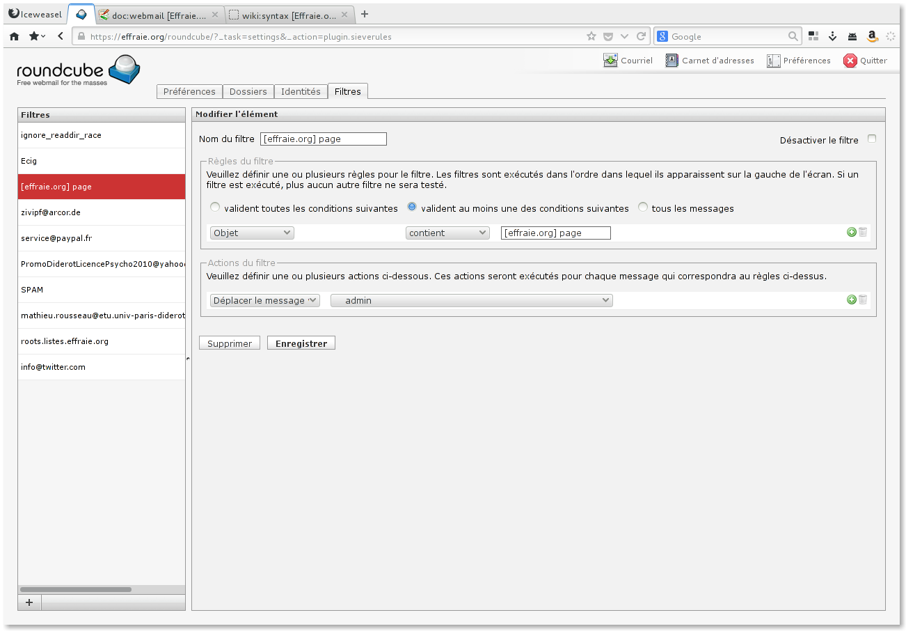 Le serveur utilise un protocole appelé SIEVE pour filtrer les emails, directement sur le serveur, ce qui a de nombreux avantages : votre boite principale peut être désengorgé, vous pouvez trier les emails dans des dossiers automatiquement (par exemple, les emails venant de untel vont dans le dossier UNTEL), configurer une réponse automatique quand vous êtes absent, ou filtrer les spams2).