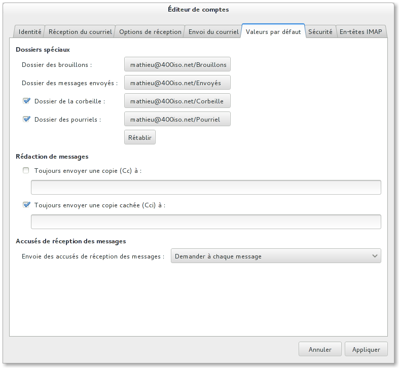 Vous ne devez en aucun cas les modifier, sans quoi vous aurez des dysfonctionnements. Si vous avez fait une mauvaise manipulation, rendez vous dans préférences > dossiers spéciaux et assurez vous d'avoir la configuration ci-dessous :