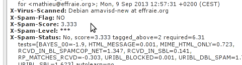 Ce système passe au crible tout les emails qui lui arrivent, et leur attribue un score en fonction de règles qui s'améliorent collaborativement 3).